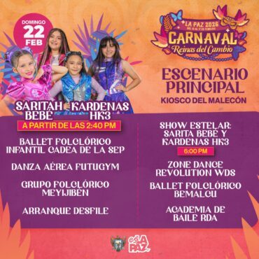 A las 4:00 de la tarde iniciará el desfile de carros alegóricos, más tarde se presentarán Saritah Bebé y Kárdenas HK3 en el escenario principal El DIF Municipal y el XVIII Ayuntamiento de La Paz invitan a las familias paceñas a disfrutar del tradicional Carnavalito 2026, evento totalmente gratuito que se llevará a cabo este domingo 22 de febrero en el Malecón, con el desfile de carros alegóricos y comparsas, […]