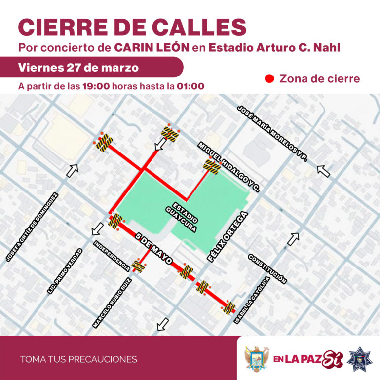 La Dirección General de Seguridad Vial y Transporte informa que este fin de semana se implementará un dispositivo de cierres viales; el viernes en calles aledañas al Estadio Arturo C. Nahl por el concierto de Carin León, el sábado debido a la carrera pedestre ‘‘Corre por tu Salud’’ en el CDM “El Piojillo” y el domingo en el malecón para el ‘‘Triatlón Es La Paz 2026’’.