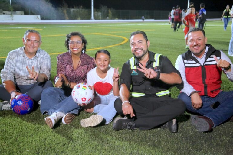 Asimismo, informó que el espacio dispone de un sistema de alumbrado tipo estadio con 48 reflectores LED y luminarias solares, además de la rehabilitación integral de gradas, vestidores y sanitarios, incluyendo la renovación de instalaciones hidrosanitarias y eléctricas. También se construyó un cerco perimetral de 580 metros lineales para resguardar el recinto.