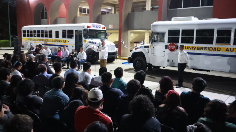 Acompañado por el rector de la UABCS, Dante Arturo Salgado González, y